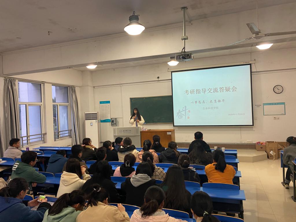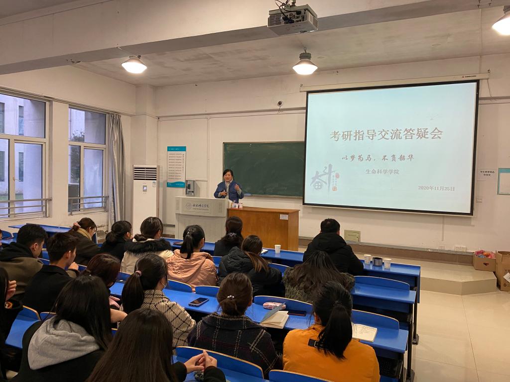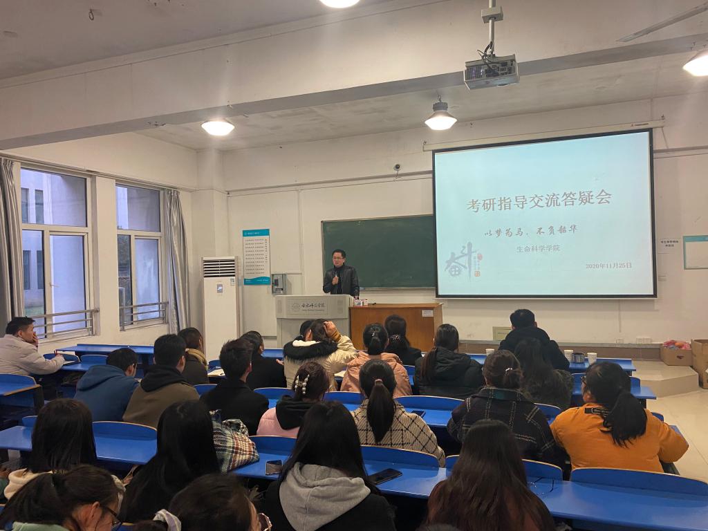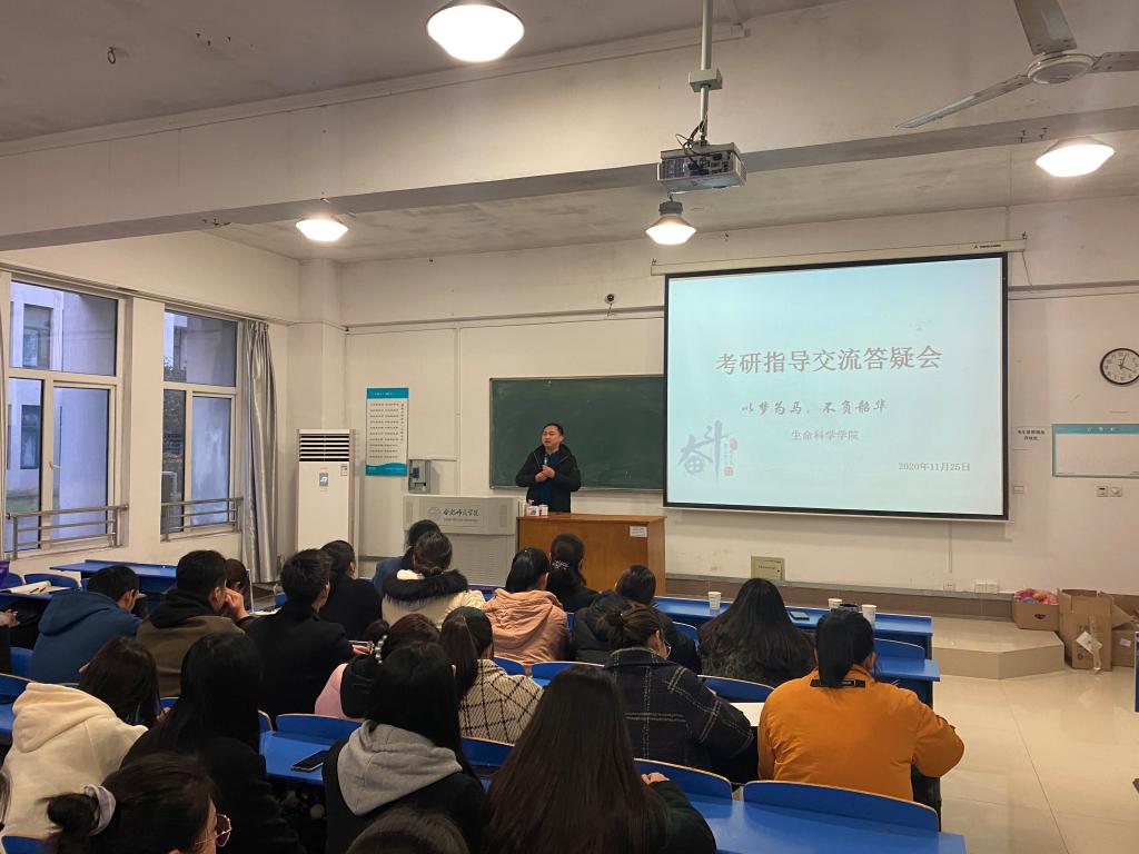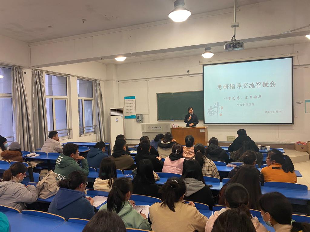 本网讯 为帮助考研学生答疑解惑,指导他们如何备战,缓解考前压力,提高成功率。11月25日下午生命科学学院于逸夫楼A106开展了学生考研指导交流答疑活动。出席该活动的有生命科学学院党委书记郭桃芬、副院长朱桂兰,教工党支部书记王占军、陈金武,教师党员程诚、王恒生四位老师主讲。指导交流活动由2017级辅导员黄伟丽主持,2017级100余名报名考研的学生参加。