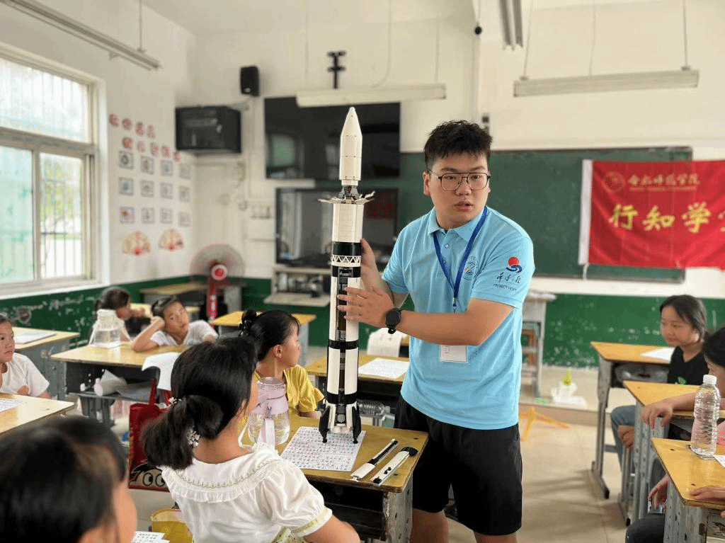 mile米乐集团官网的王庄村行知学堂的小先生在驻村书记李万成的指导下,认真谋划学堂内容,积极打造逐梦科普等特色课程,激发孩子们的好奇心和想象力,为孩子们的未来蓄能。逐梦科普课程分为三个阶段,首先是小先生介绍我国航天空间站的构造,利用空间站的模型和视频向孩子们展示了近年来我国取得的航天成就。其次是介绍火箭的发射原理,利用火箭模型,对火箭的各个部位进行详细的介绍。最后,孩子们在了解了基本的空气动力学和飞行力学等方面的知识后,在小先生们的帮助下,孩子们利用手中的废旧塑料瓶,一个水火箭模型组装完毕。