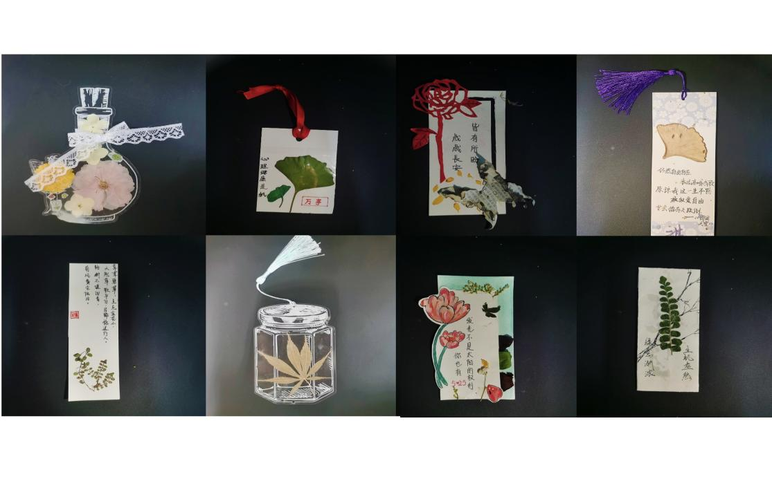 同学们通过选取植物标本、手工压制、自由涂鸦等创作程序,融合自己的奇思妙想,将抽象的情感思绪转化为具象的书签实物,绘制出一件件外观新颖、版面精美的书签,并在书签上写下了自我激励、美好祝福等温馨寄语,抒发内心的真情实感。