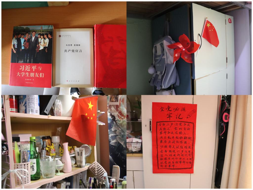 同学们积极创新,秀出各自寝室的风格与特色。有以红色为主题,充满了浓厚的红色气息,入目便是那鲜艳的五星红旗,充分展现了生在新中国长在红旗下是多么的骄傲和幸福;有以书香气息为主题,充满了文化氛围,寝室门口风格多彩的门牌,苍劲有力的书法,对仗工整的门联无不让寝室展示出满满的生机与活力;有以温馨浪漫为主题,用黏土装饰的镜子,用毛绒球挂饰装饰的吊顶,还有精心制作的照片墙,充分展现出干净舒适又不乏梦幻多彩的美好小家。整洁温馨的寝室,搭配上同学们精彩的解说,让到场的评委们连连拍手称赞。