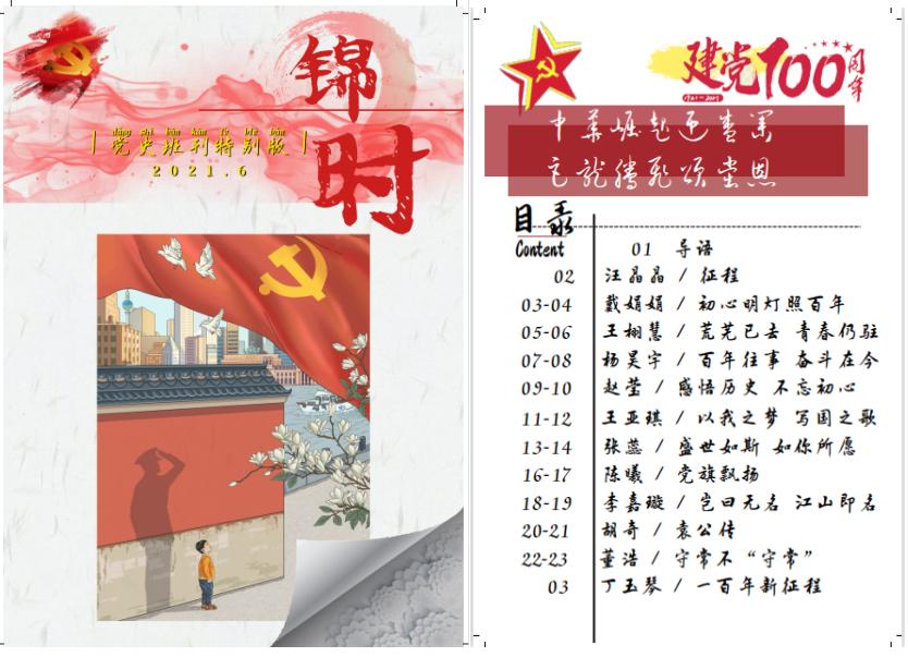 紧扣“用心学史、用情领悟、用笔记录、用力落实”的编纂初衷,3003新葡官方网站党委高度重视,2019级汉语言文学(师范)1班、2班班刊编委会在辅导员郝嘉乐老师的指导下,经过选题、组稿、审稿、编校、封面设计、出版等一系列环节,历时两月有余,完成党史学习教育专题班刊。自征稿以来,班级同学积极响应,成刊共收录作品27篇,内容包含党史学习教育感悟、树立理想信念、自强立志成才、革命书籍影片观感等丰富内容。