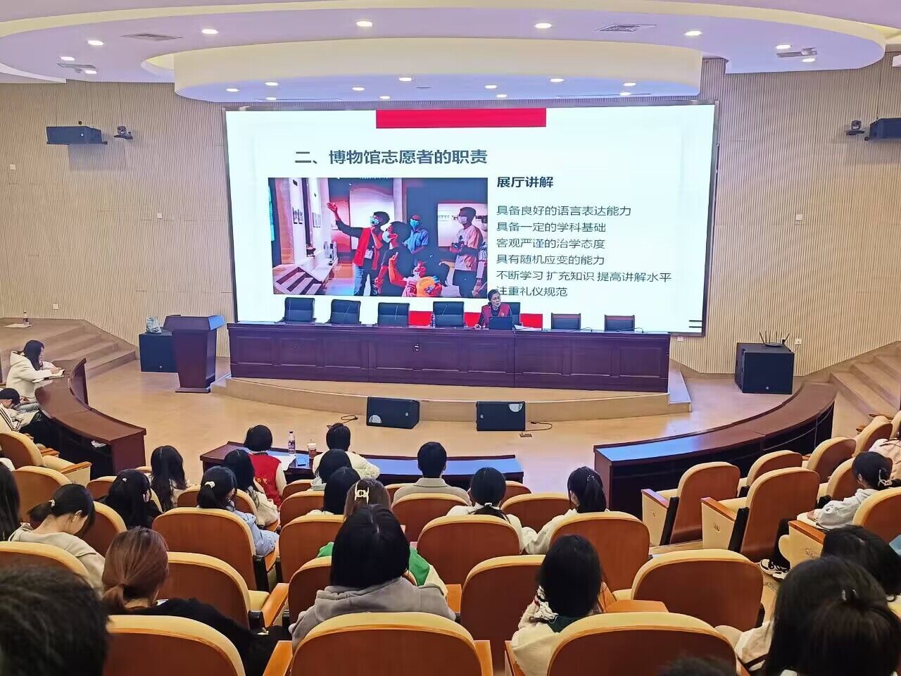 宣讲会上,安徽博物院龙静从博物馆志愿者定位、职责、责任及收获等方面介绍了志愿者的使命和担当;刘绮格为同学们详细介绍了安徽博物馆里的国宝级文物;刘恒从服务内容、服务形式、管理形式等方面介绍了志愿服务队建设的愿景。并与同学们积极互动交流,现场气氛热烈非常。