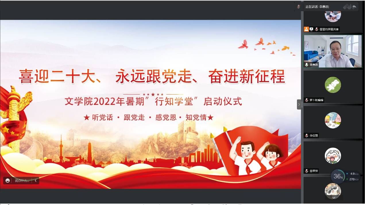 624日上午,3003新葡官方网站召开了以“喜迎二十大、永远跟党走、奋进新征程”为主题的2022年暑假行知学堂实践活动线上启动仪式。3003新葡官方网站党委书记李旺生、分团委负责人李惠恩、疏淑进以及全体小先生出席了启动仪式。启动仪式由李惠恩主持。