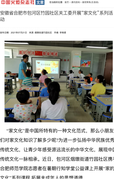 在“家的文化”系列传统文化公益课堂上,“小先生”组织开展了“安徽建筑”知识竞赛、寻找“家乡之味”主题演讲、解读“家”字之美等丰富多彩的主题活动,活动增强青少年对中华优秀传统文化的自信心和自豪感,激发了孩子们学习和传承优秀传统文化的兴趣和热情。