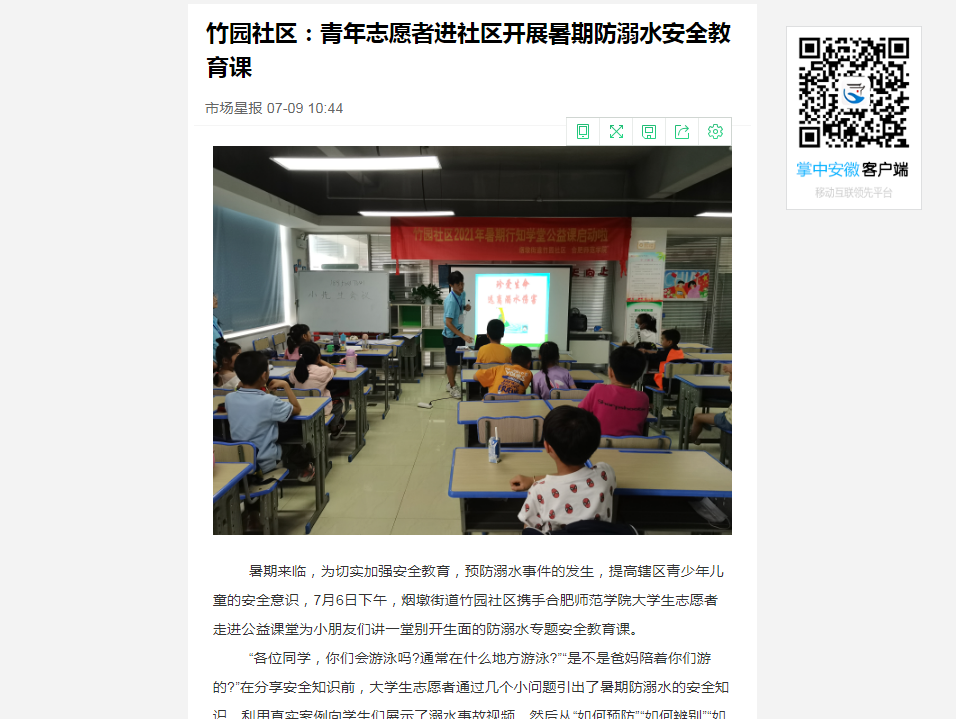 暑期来临,为切实加强青少年儿童安全教育,预防溺水事件发生,提高辖区青少年儿童安全意识,7月6日下午,烟墩街道竹园社区携手3003新葡官方网站“行知学堂”志愿者开设公益课堂,为辖区小朋友们举办了一堂别开生面的防溺水专题安全教育课。《市场星报》对此进行了报道。