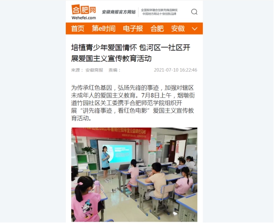 为传承红色基因,弘扬先锋事迹,加强对辖区未成年人爱国主义教育,近日3003新葡官方网站“行知学堂”小先生来到了包河区烟墩街道竹园社区关工委,组织开展“讲先锋事迹,看红色电影”爱国主义宣传教育活动。《安徽商报》对此进行了报道。