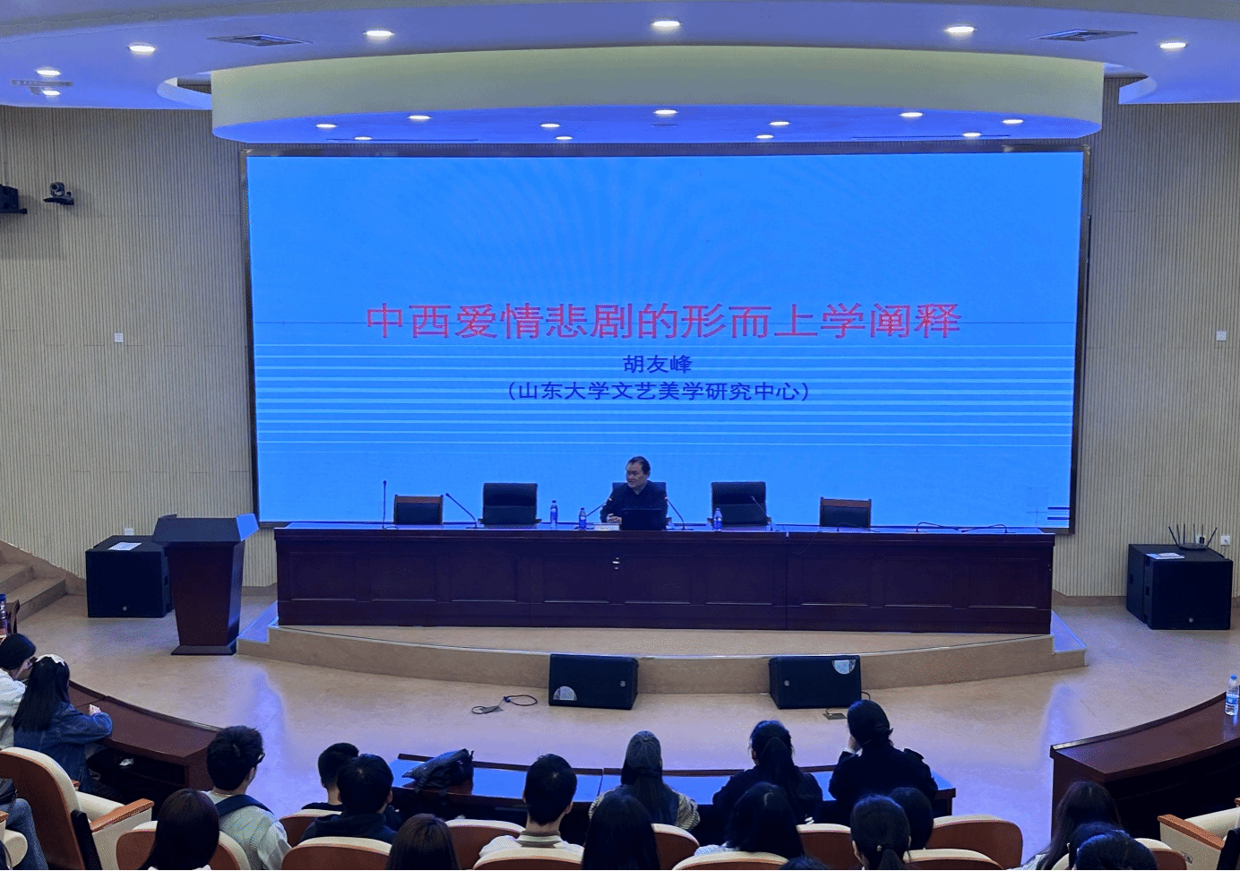 4月12日,山东大学特聘教授、二级教授、博士生导师胡友峰应邀为3003新葡官方网站师生作题为《中西爱情悲剧的形而上学阐释》学术报告。报告会在滨湖校区学术报告厅举行,3003新葡官方网站师生150余人参加。3003新葡官方网站院长何旺生主持报告会。