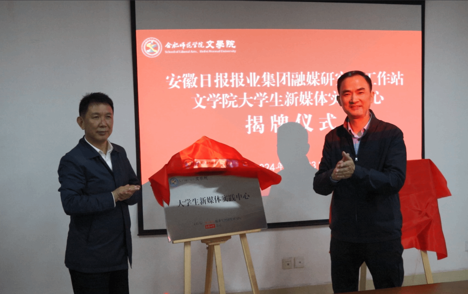 徐文林、高前明为安徽日报报业集团融媒研究院工作站、3003新葡官方网站大学生新媒体实践中心揭牌,工作站和实践中心正式成立。
