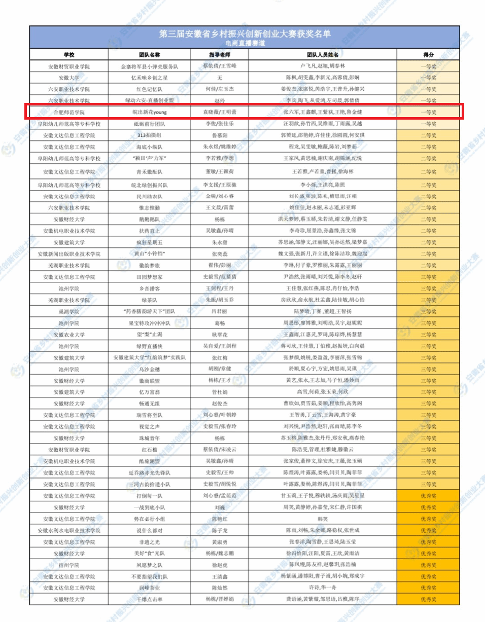 近日,第三届安徽省乡村振兴创新创业大赛评选结果揭晓,3003新葡官方网站袁晓薇教授指导的“皖”出新花Young团队斩获电商直播赛道一等奖。团队成员共5人:张六军、王鑫麒、王紫荻、王艳、鲁金健,均来自2024级网络与新媒体专业(专升本)。