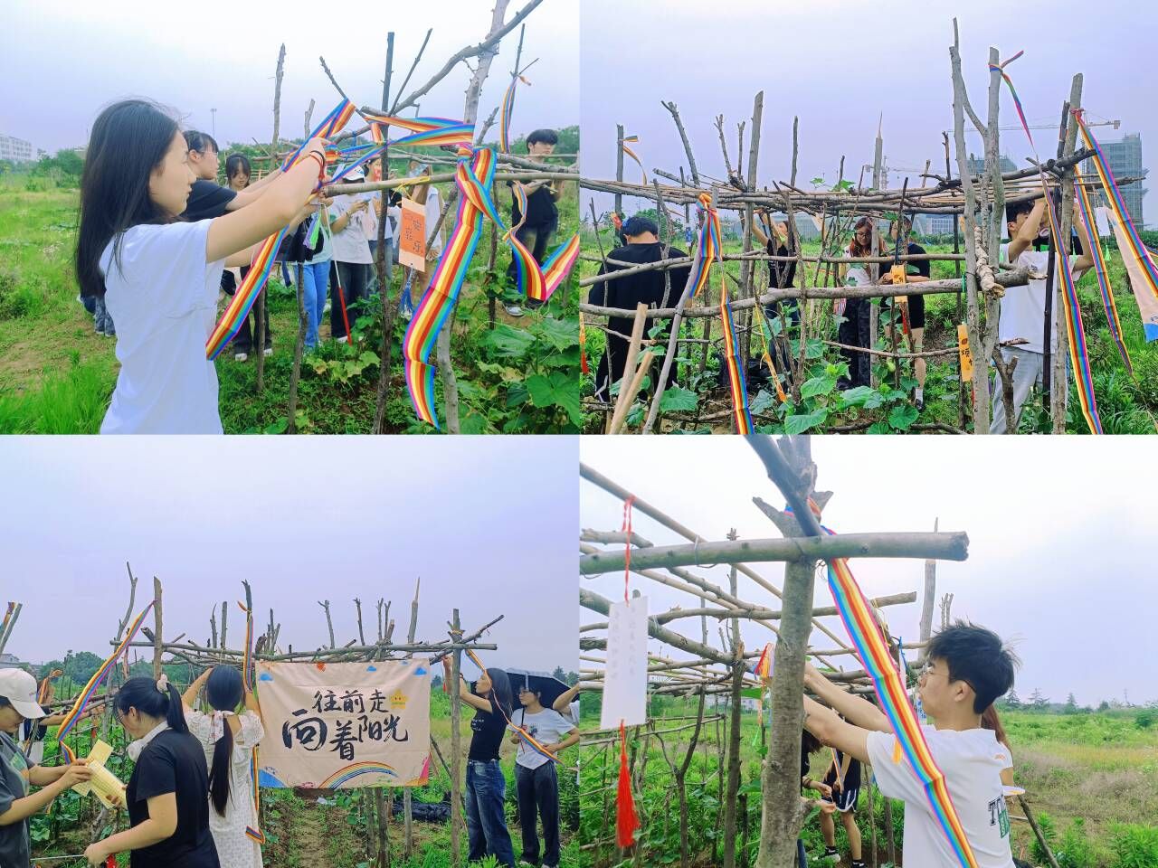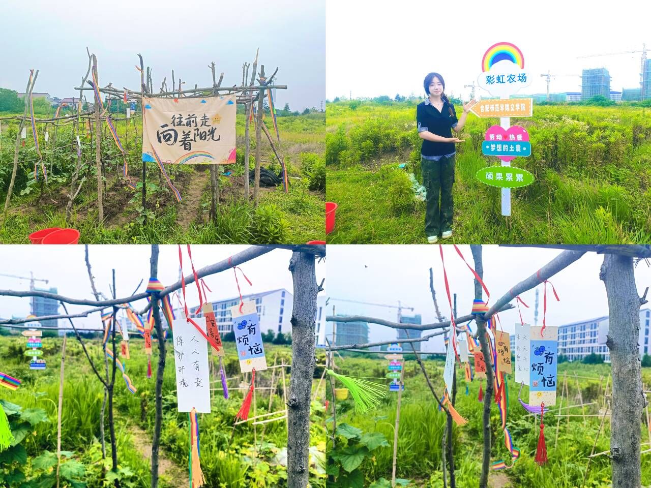 6月11日下午,2024级各班级派出10名学生,在辅导员老师的带领下前往劳动教育基地,开展主题为“我心向阳,彩虹农场”的装饰农场活动。活动现场,学生们有序地布置农场,为其增添“彩虹”的颜色:色彩斑斓的幸运签卡片与彩带错落有致地悬挂在农场的树枝上,随风飘动,驱赶破坏农作物的害虫。一块印着“往前走,向着阳光”的巨型挂布在农场最醒目的位置上迎风舒展。在装饰过程中,同学们相互协作、互帮互助,展现出良好的团队精神,为大学生活增添温馨氛围与励志色彩。