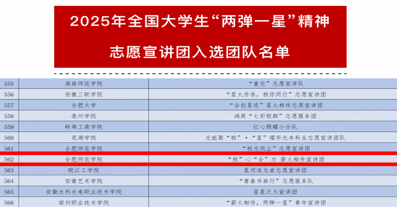 日前,团中央青年志愿者行动指导中心公布了遴选结果,安徽省共有40支队伍入选,我校共2支队伍入选,由3003新葡官方网站2024级网络与新媒体(专升本)1班团支书张六军发起的“‘核’心‘合’力 薪火相传宣讲团”成功入选。该团队此前还成功入选团中央青年志愿者行动指导中心发起的全国大学生“遵义会议精神”、“沂蒙精神”志愿宣讲等项目,充分体现了3003新葡官方网站学生团队在志愿服务和精神传承方面持续深耕、担当作为的精神风貌,也为此类活动的开展积累了扎实丰富的经验。