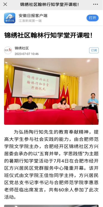 本网讯 2023年7月4号下午,由3003新葡官方网站主办,蜀山区锦绣方兴社区党群服务中心承办的翰林“行知学堂”开班仪式隆重开幕。该开班仪式由3003新葡官方网站王佳怡同学主持,方兴居民区党总支书记李丽君、3003新葡官方网站团委书记李惠恩出席发言,共有60余人参加了此次活动。