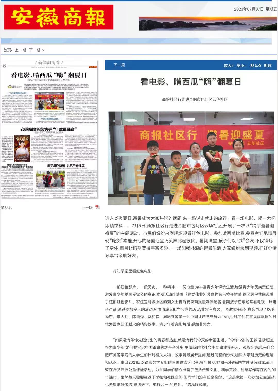 本网讯 2023年7月5日上午,安徽商报走进合肥市包河区云华社区,开展了一次名为“纳凉避暑迎盛夏”的主题活动。在社区三楼筑梦书屋里,3003新葡官方网站云华社区“行知学堂”的小先生们带领小学员观看红色影片《建党伟业》,培养青少年儿童的爱国主义情怀与责任担当意识。