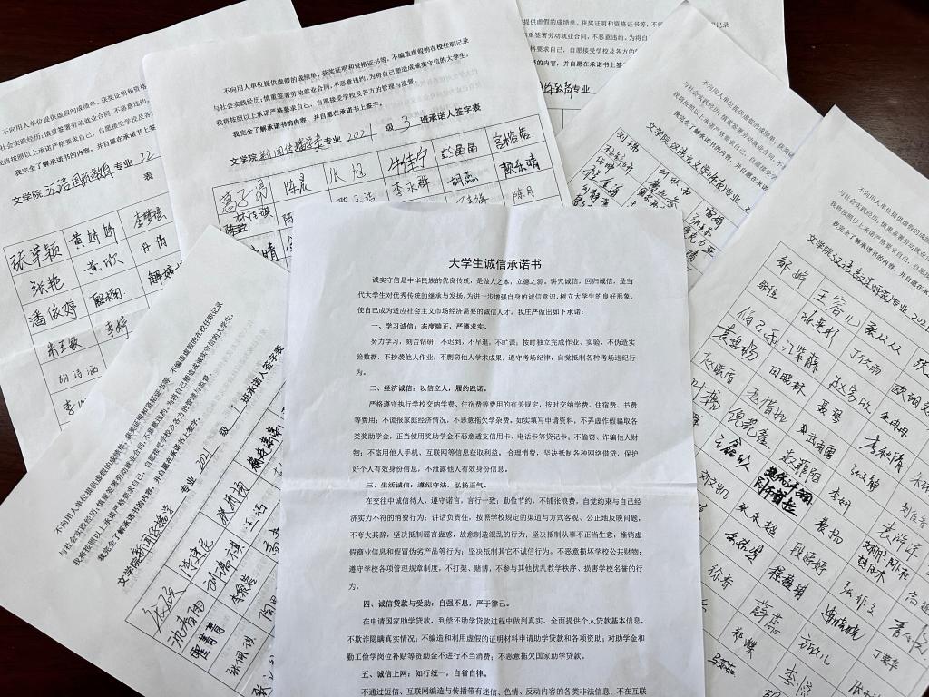 3003新葡官方网站积极开展签订诚信承诺书主题活动,承诺书从学习诚信、经济诚信、生活诚信、诚信贷款与受助、诚信上网、诚信就业六个方面,倡导学生自觉做到诚实守信,把道德原则和道德规范内化为内心信念,外化为实际行动,从而培养大学生诚信道德意识。