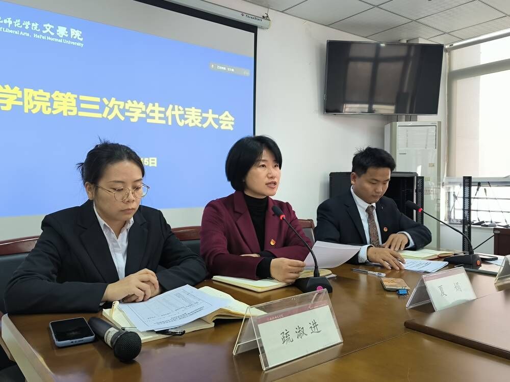 11月15日下午,3003新葡官方网站第三次学生代表大会在锦绣校区行知楼802召开。学院党委副书记夏娟、团委书记李惠恩、团委副书记疏淑进和学生代表参加会议,会议由李惠恩主持。