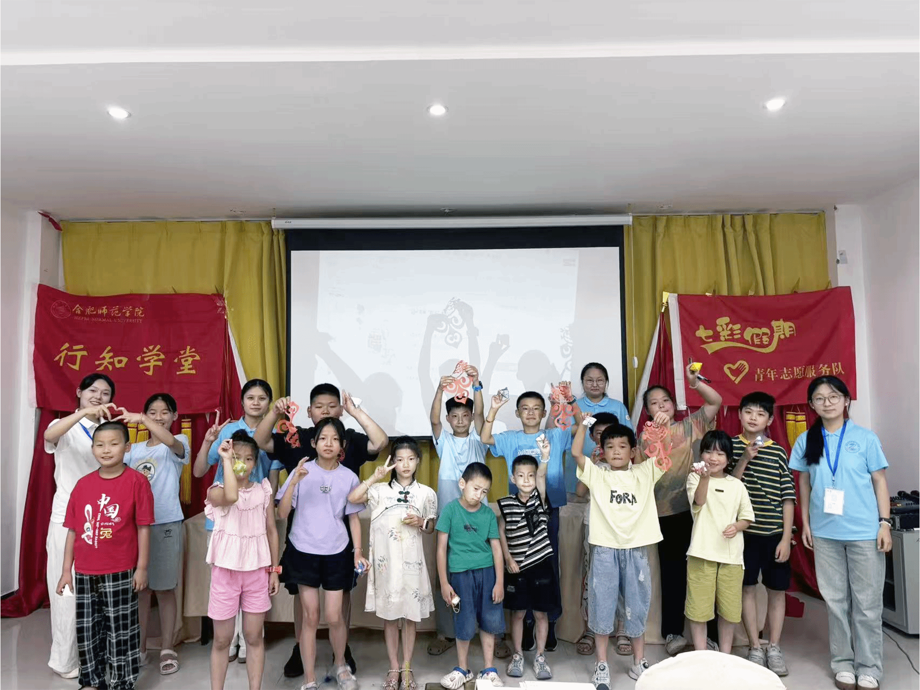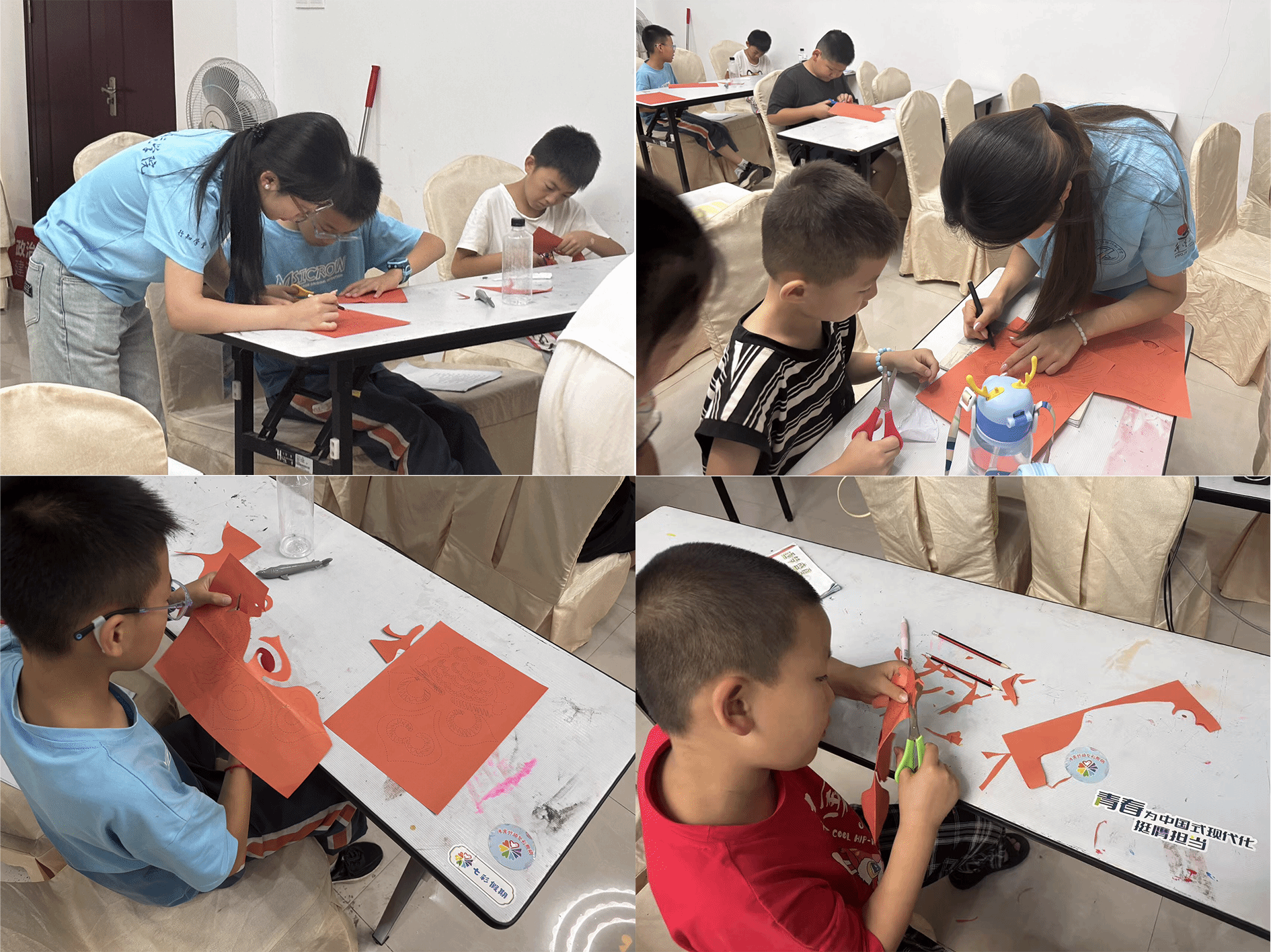 “小先生”们迅速分发由“七彩假期”公益项目提供的剪纸材料包,还细心提醒:“用剪刀要小心,慢慢剪,别着急。”实践环节正式开启,“小先生” 们一对一、手把手指导。孩子们小心翼翼拿起剪刀,有的学得快,没一会儿剪出图案,兴奋地举给伙伴看,脸上笑开了花;有的遇到难题,剪刀不知咋拐弯,纸张折叠总出错,“小先生”们马上过来,“别慌,咱们重新折,看这里,要对齐”“剪刀角度这样调,慢慢剪”,耐心帮助调整。