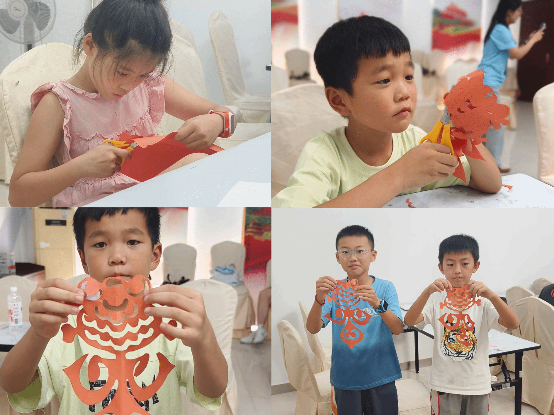 紧接着,课程进入重中之重——剪纸教学。韦佳怡详细介绍:“剪纸是中国传统民间艺术,历史能追溯到很久以前,题材特别广,不管是花鸟鱼虫,还是神话故事,都能剪出来,风格也很独特,寄托着大家对生活的美好祝愿。” 为让孩子们清晰理解,她又讲解单色剪纸和彩色剪纸的分类,演示制作步骤,“先选好纸,对折要整齐,剪的时候注意线条流畅……” 边说边用剪刀熟练操作,仿佛赋予纸张魔法。“想不想自己试试,像变魔术一样剪出漂亮图案?”韦佳怡充满童趣的提问,瞬间点燃孩子们热情,大家异口同声喊 “想”,眼神里满是跃跃欲试。