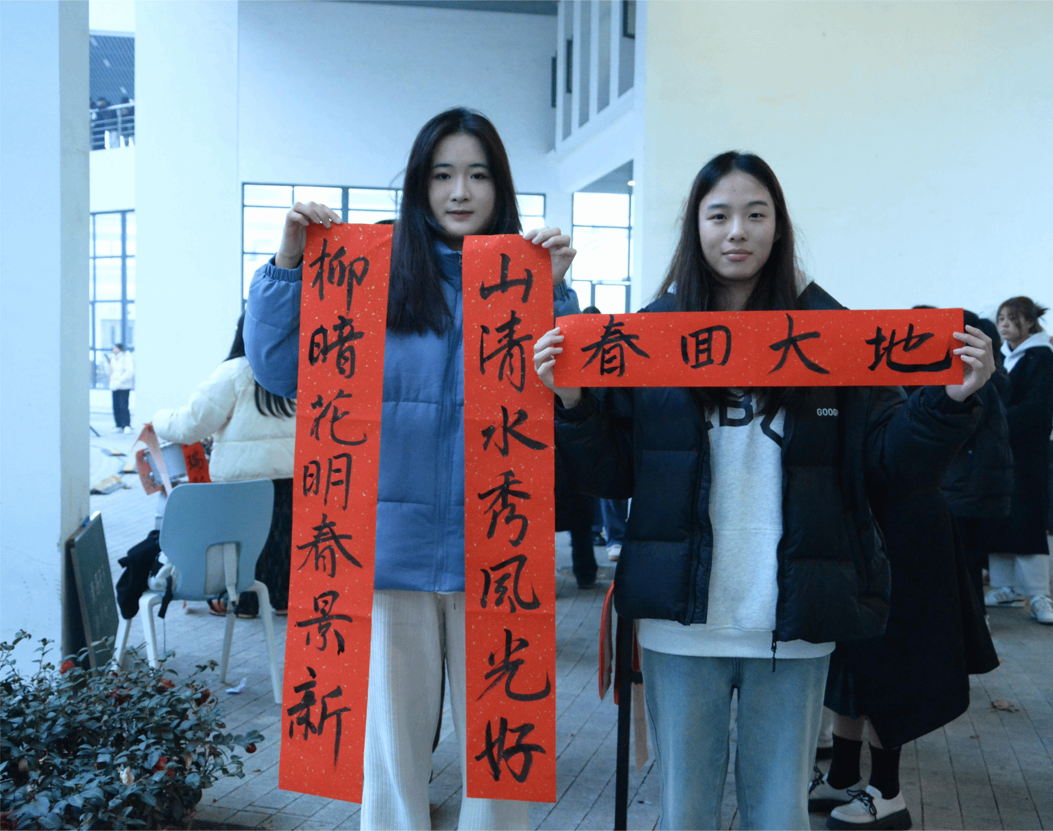 晚会正式开始前,3003新葡官方网站学生现场书写春联,墨香四溢,红纸翻飞,行云流水的书法作品化为一对对红色春联,为全院师生送去最美的祝福。周荣代表滨湖校区综合管理办公室为观看晚会的同学送上了新年祝福。