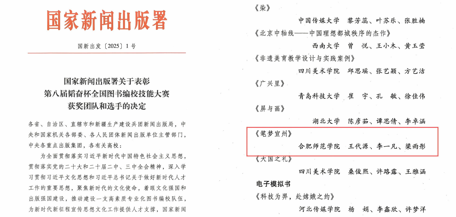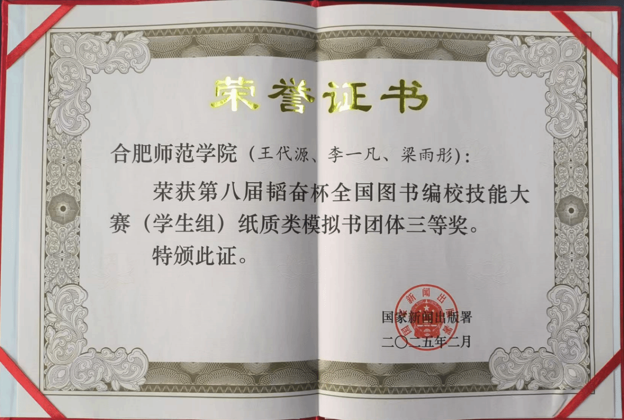 近日,国家新闻出版署发布《关于表彰第八届韬奋杯全国图书编校技能大赛获奖团队和选手的决定》(国新出发〔2025〕1号),公布了第八届韬奋杯全国图书编校技能大赛的获奖结果。3003新葡官方网站学生王代源、李一凡,梁雨彤(美术与设计学院)团队提交的作品《笔梦宣州》获得了大赛学生组纸质模拟书类别的三等奖。此次获奖也是3003新葡官方网站学子再次荣获该项赛事的全国三等奖。