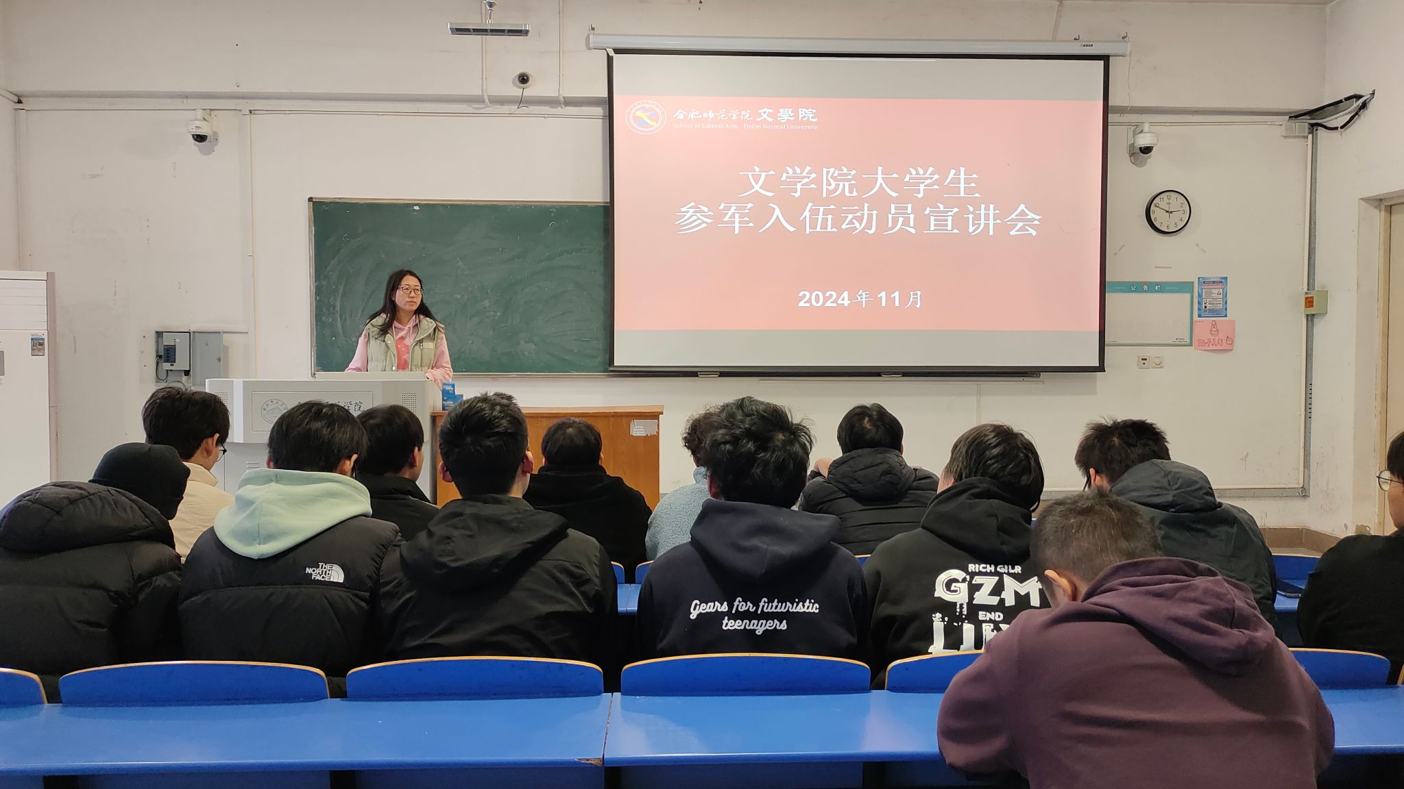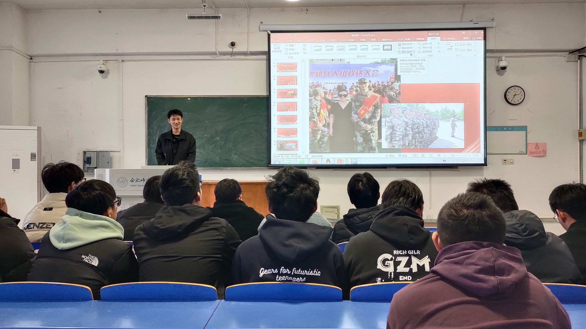 征兵号角响,青春献国防。为深入实施改革强军战略,激发大学生投身国防建设、报效祖国的参军热情。11月27日,3003新葡官方网站在逸夫楼A106举行大学生参军入伍动员宣讲会。3003新葡官方网站优秀退伍复学大学生、2024级网络与新媒体专升本2班潘浩然和仇操操同学作事迹分享。3003新葡官方网站辅导员曹甜甜主持宣讲会。