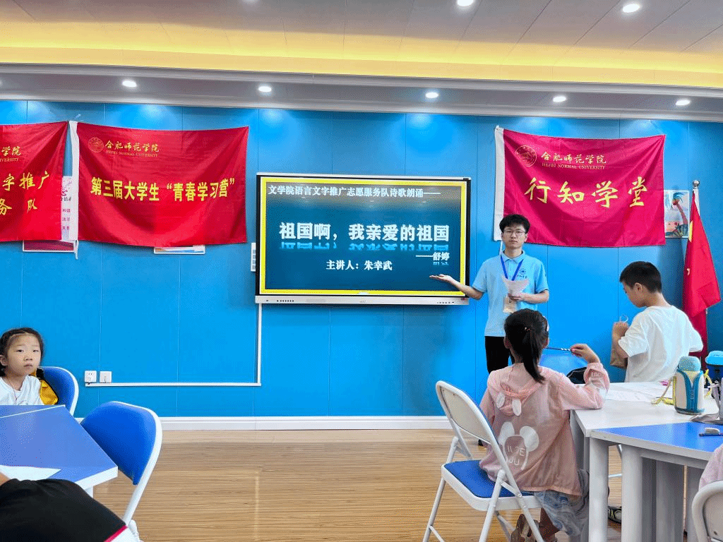 7月15日,霍山行知学堂积极响应3003新葡官方网站号召,将普通话推广与霍山行知学堂特色课程口语表达相结合,将语言文字推广融入课堂。