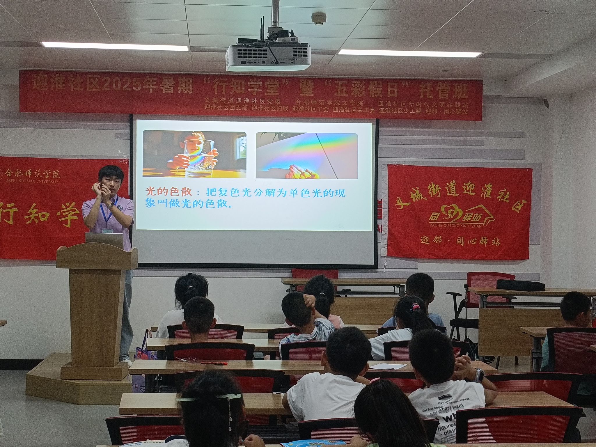 活动伊始,主讲人李旭通过展示一系列绚丽多彩的光现象图片和视频,如极光的美轮美奂、霓虹灯的五彩斑斓,引发了青少年们对光的好奇与惊叹,自然地引出了本次活动的主题——神奇的光变。行知学堂的“小先生”们也在一旁积极协助,引导孩子们有序就座,并为他们发放实验所需的材料,为后续的活动开展做好充分准备。