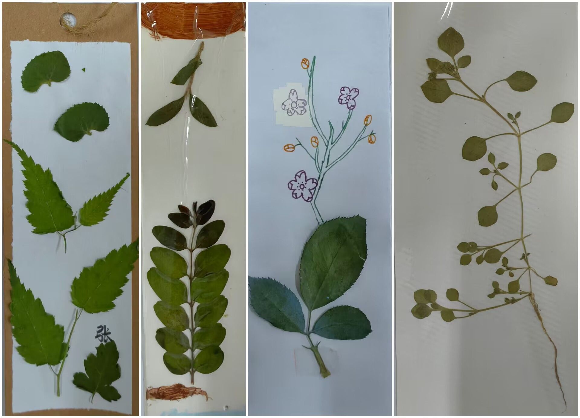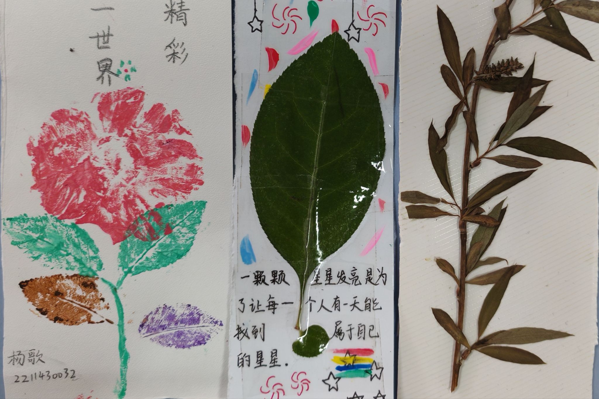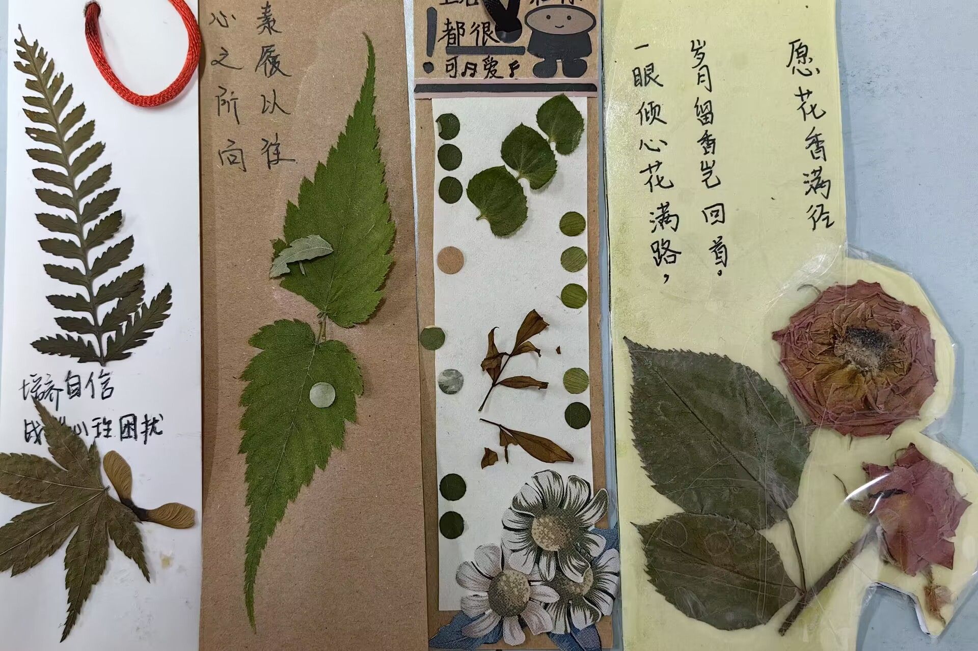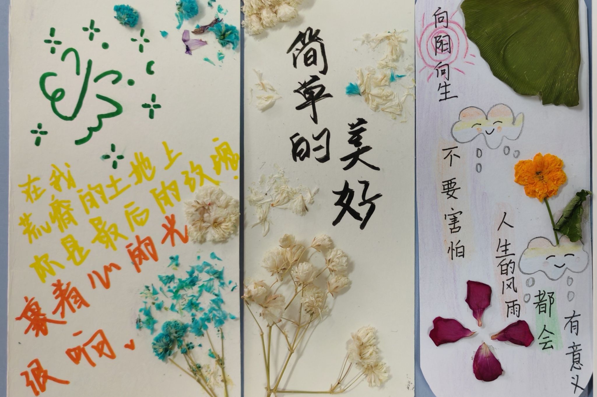 同学们通过选取植物标本、手工压制、自由涂鸦等创作程序,融合自己的奇思妙想,将抽象的情感思绪转化为具象的书签实物,绘制出一件件外观新颖、版面精美的书签,并在书签上写下了自我激励、美好祝福等温馨寄语,抒发内心的真情实感。