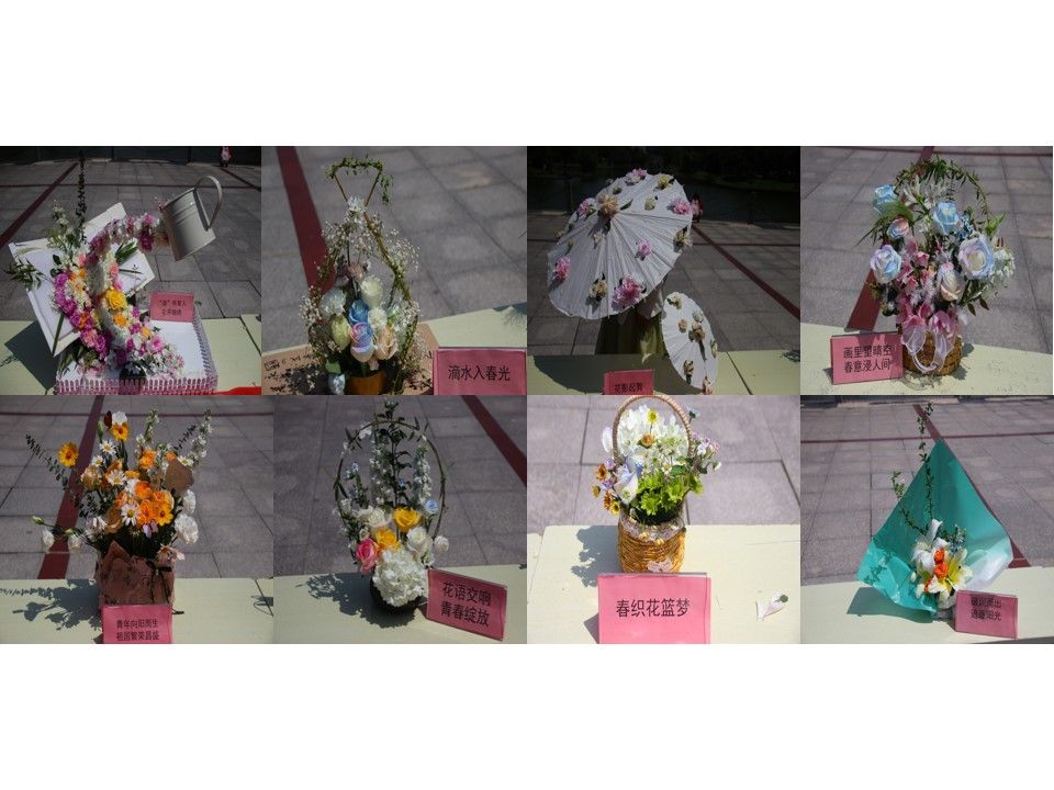 活动伊始,各参赛队伍将作品呈现于竹园广场展示台上,并由各作品制作代表依次对作品的创作理念、花卉造型构建、每种花卉代表的寓意、制作过程等进行讲解。其中李梦媛小组制作的《“浇”书育人,花开锦绣》花的瀑布从书中流淌不息,寓意教师精神代代相传,也传递着学生被教师的爱浇灌,心田花开;许可雯小组作品《花影轻舞》以中国非遗油纸伞为本体创作,表达了对美好生活的向往,也承载着对传统工艺、历史文化的追溯;蒋荧小组作品《滴水入春光》以水滴为主题表达对生命的尊重,也寓意着自然循环和生命的再生,倡导大家保护水资源。